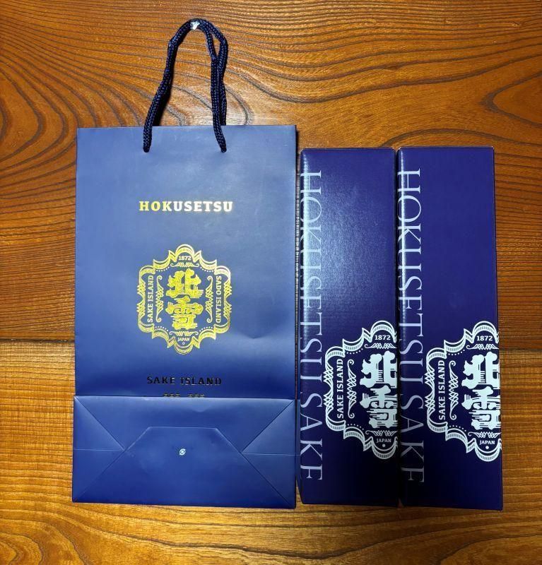 北雪ロゴ入りの紺色の手提げ袋(大)です。